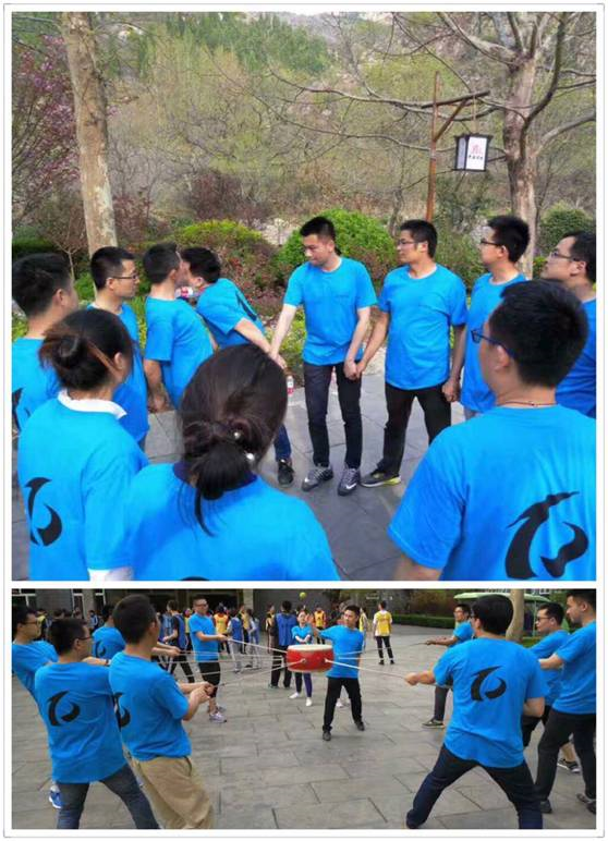 拓展训练中还有,鼓动人心(团队成员每人手拉一根绳子,用鼓面来击球),群龙取水(借助团队所有成员帮助,将自己身体完全交给队友,笔直的放心身体,拿取指定范围内的水瓶)让我们深刻体会到团队合作的重要性,更加的感悟到理解与相信,是方便留给自己还是留给队友。